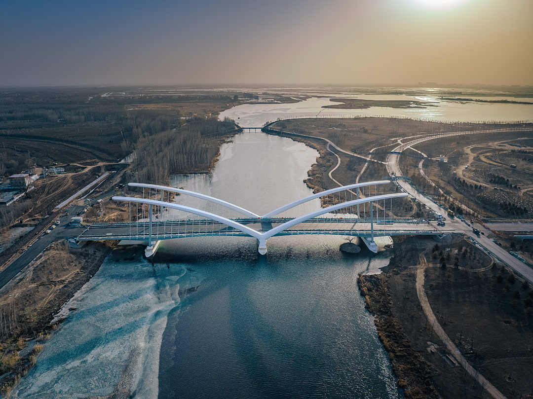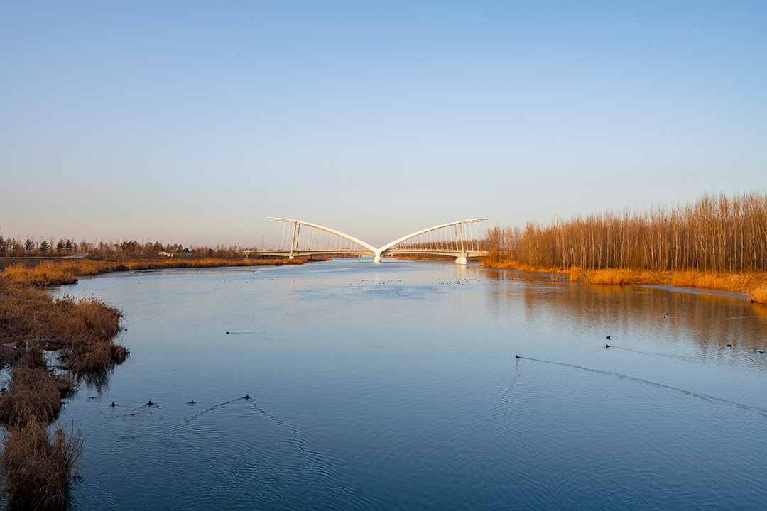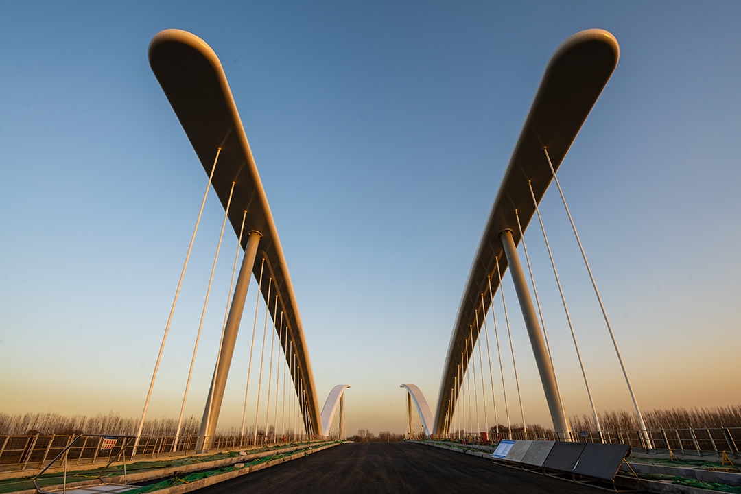 大橋全長259米,造型以鷺鷥涉水時舒展的羽翼為原型,取展翅翱翔,高飛于空的意境,將人文理念融合于雄安灣生態自然的景觀中。以“展翅高飛”為景觀主題,塑造整體協調、重點突出的夜間燈光效果,營造“清新、亮麗、現代、雅致“的夜間橋梁景觀形象。橋梁全線有功能照明和可分級控制的景觀照明,為平日和節日提供不同的照明效果。