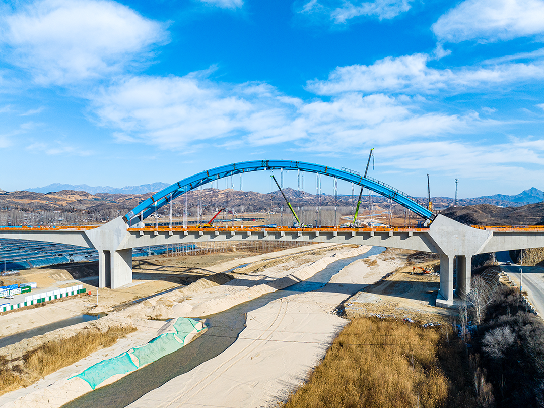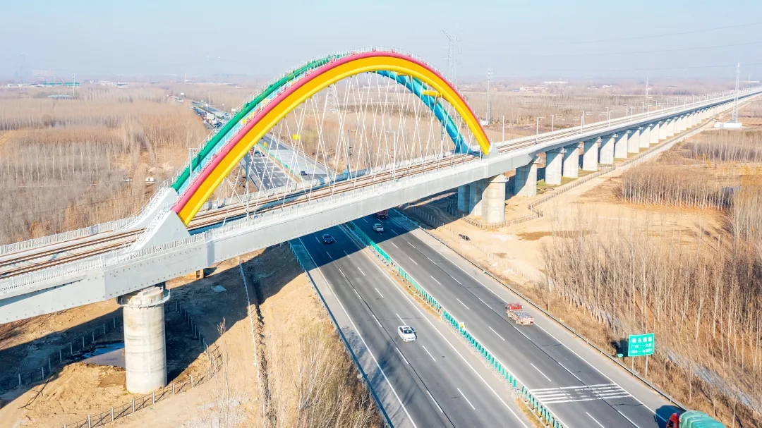 “花式跨越”彩虹橋——京雄城際鐵路跨大廣高速系桿拱橋,是京雄城際鐵路的重要組成部分,對完善京津冀區域路網布局、構建快速立體式交通體系有重要意義。巨力索具承接該橋上部結構施工。