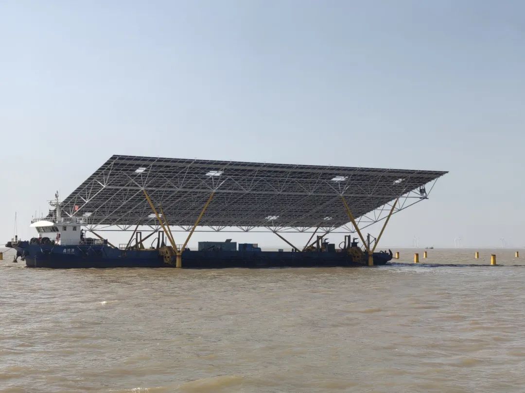 海上光伏整體結(jié)構(gòu)浮托運(yùn)輸調(diào)節(jié)裝備是利用駁船在淺海對(duì)光伏組件整體結(jié)構(gòu)進(jìn)行浮托運(yùn)輸、安裝的裝備。本裝備通過創(chuàng)新設(shè)計(jì)舉升系統(tǒng)、伸縮梁等關(guān)鍵部件,有效提升了光伏組件整體結(jié)構(gòu)安裝的施工效率、施工穩(wěn)定性以及安裝精確性,同時(shí)解決了安裝空間受限等問題。為海上光伏組件提供了一套可在從運(yùn)輸?shù)桨惭b的整體解決方案,降低了浮吊船的使用頻率,降低海上光伏運(yùn)輸和安裝的成本,提升了海上光伏的安裝效率,有效推動(dòng)了整個(gè)產(chǎn)業(yè)鏈的技術(shù)升級(jí)。