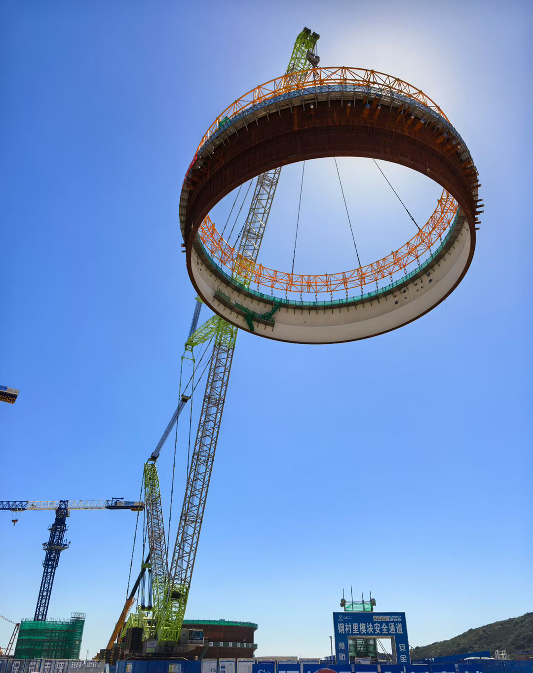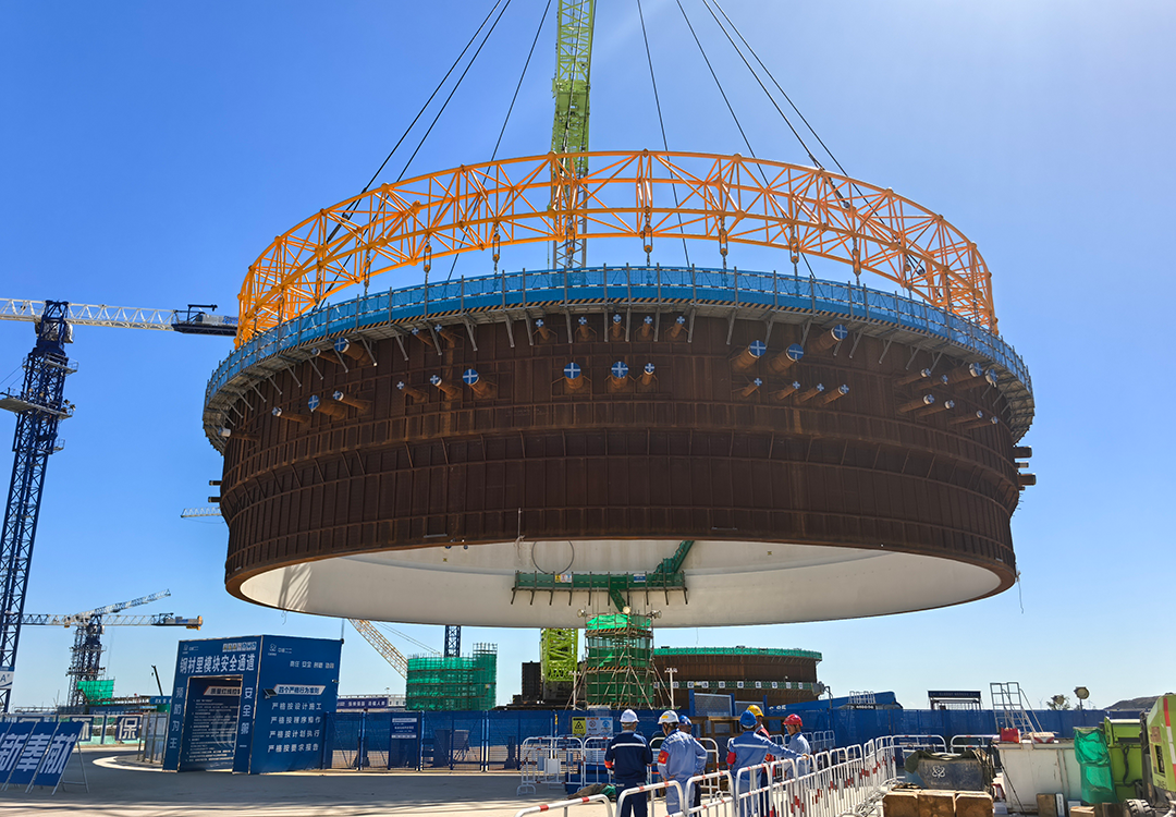 9月28日,金七門核電1號(hào)機(jī)組鋼結(jié)構(gòu)安全殼鋼襯里模塊一平穩(wěn)落位,首個(gè)大型模塊吊裝任務(wù)圓滿完成。此次吊裝采用了以巨力索具環(huán)形吊具為代表的先進(jìn)吊裝技術(shù),實(shí)現(xiàn)了安全精準(zhǔn)的吊裝作業(yè)。