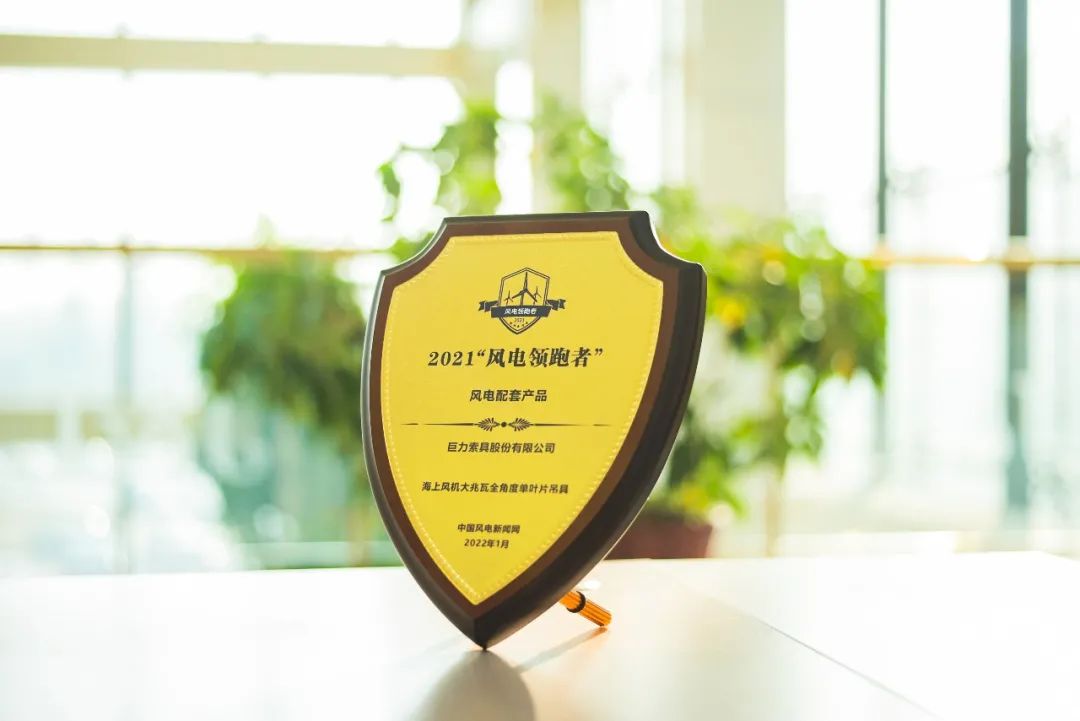 2022年1月8日,由中國風電新聞網主辦的2021(首屆)“風電領跑者”技術創(chuàng)新論壇暨頒獎盛典在北京成功舉行。巨力索具憑借“國內首臺50噸大兆瓦全角度海上單葉片吊具”榮獲2021年度“風電領跑者”最佳服務產品榮譽稱號。