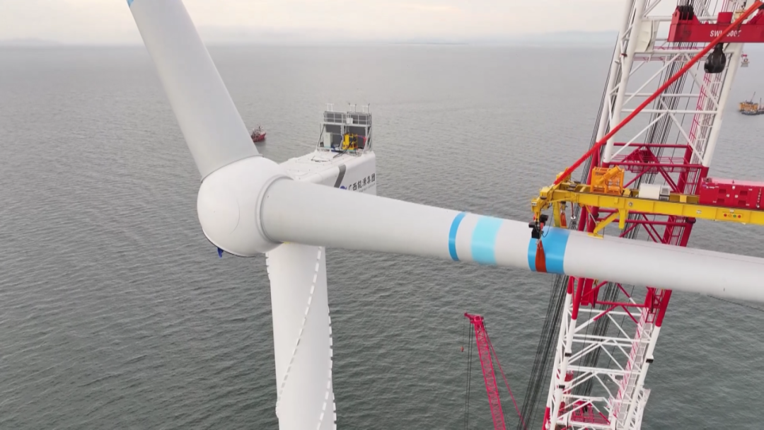 據悉,本次吊裝的風電機組單支葉片長111.5米、重42噸,葉輪掃風面積40627平方米。